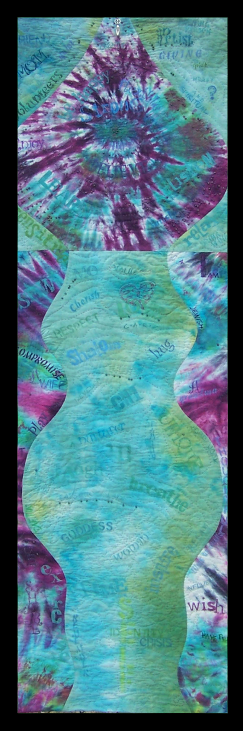 I struggle with the idea of seeing myself as a goddess but am honoring the side of me that is! There are many words that can be used to describe me; some I feel on the inside and others are ways that people may view me. It is very emotional to create a piece about yourself, to list things that swirl around in your head and your heart. I feel very confident that the viewer will understand the struggle women artists have with being everything they strive to be.