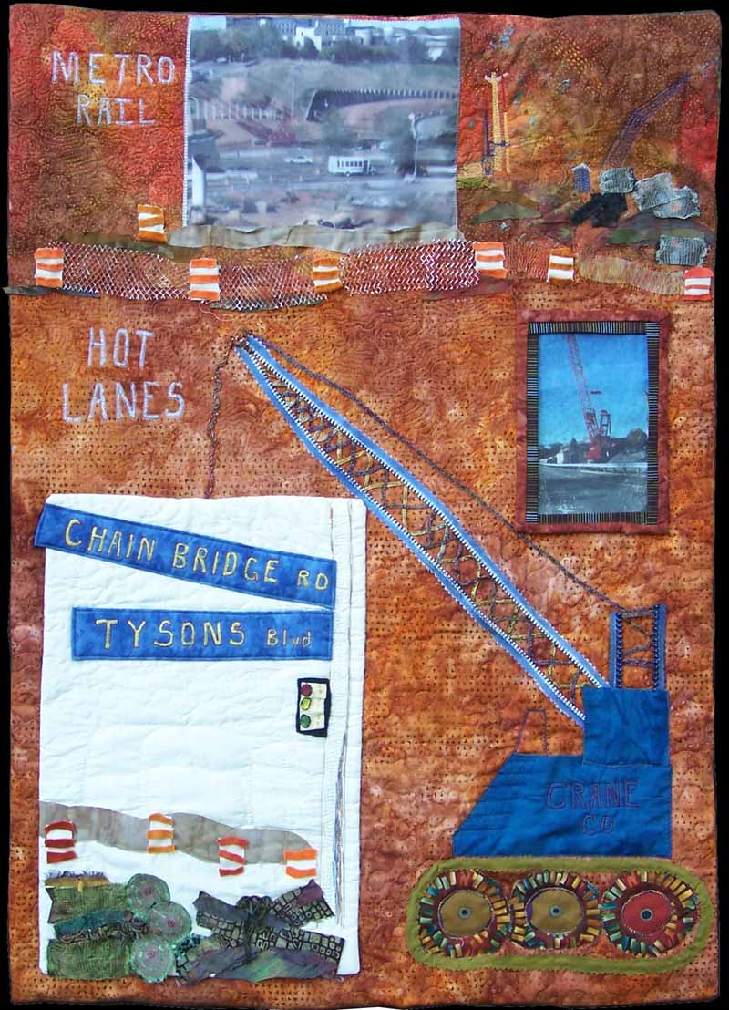 The magnitude of construction at Tysons Corner is startling. There are deep holes for the new Metro Stations. Traffic is diverted with cones, jersey barriers and flashers everywhere. New and old signs proliferate to add to the confusion. All the trees are down and only a flock of huge cranes rises above the skyline now. Earthmovers, dump trucks, bulldozers and piles of pipes litter the new landscape.